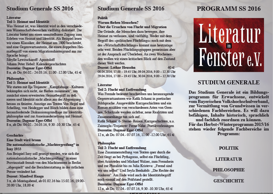 Das Programm SS 2016 des Vereins „Literatur im Fenster“ e.V. bietet in Literatur, Philosophie, Politik, Geschichte und Online-Kursen vielerlei Bezüge zu gesellschaftskritischen Themen, die gemäß der Curricula dieser Erwachsenenbildungsprojekte fächerübergreifend diskutiert werden.