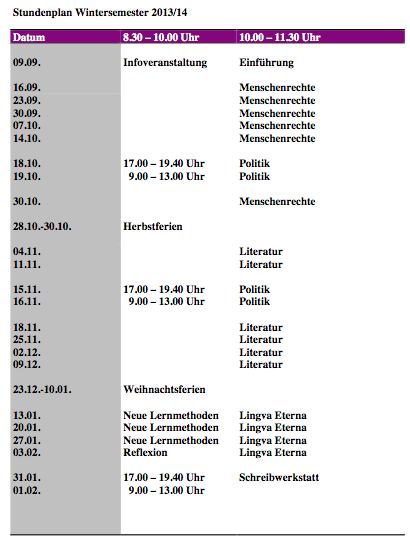 Die ersten beiden Semester dienen einem gemeinsamen Einstieg ins Lernen. Einmal wöchentlich vormittags und einzelne Freitag- abend- Samstagvormittag- Seminare sind so gestaltet, dass sie ein zeitgeschichtliches Grundwissen zur Verfügung stellen. Die Fächer Politik, Menschenrechte- Bürgerrechte- Frauenrechte, Literatur und Kommunikation sind so gestaltet, dass sie neben fächer- übergreifendem Lernen handlungsbezogene und kommunikative Kompetenzen fördern. Als Wahlfächer stehen die Arbeit mit Neuen Medien und Schreibwerkstatt auf dem Programm.